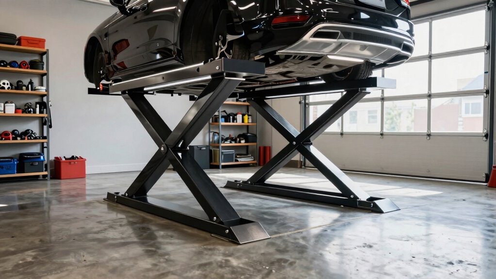 Safety considerations are paramount when choosing and installing a car lift. Always verify that the lift has the necessary certifications and adheres to safety standards. Look for features like sturdy locking mechanisms, safety pins, and secure arms to ensure the lift stays stable during operation. Remember, an improperly installed lift or one lacking safety features can pose serious risks, including collapse or injury. When installing, ensure the lift’s arms are correctly aligned and that you’re following weight capacity limits strictly. Don’t overlook the importance of regular inspections, especially before each use — check for signs of wear, loose bolts, or hydraulic leaks. Proper maintenance and adherence to safety protocols are essential to keep your workspace secure.