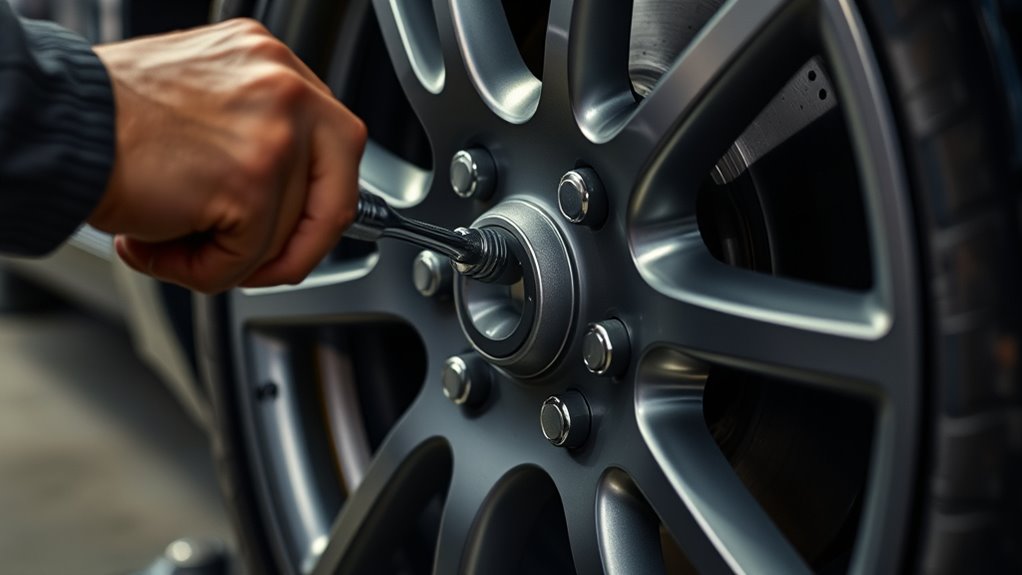 Installing lightweight wheels can improve your vehicle’s performance and handling, but it’s essential to guarantee safety and longevity. One of the critical steps in this process is ensuring your wheels are properly balanced. Tire balancing involves adjusting the weight distribution around the wheel and tire assembly to prevent uneven wear and vibrations. When you install new lightweight wheels, unbalanced tires can cause vibrations that affect steering and comfort. Proper tire balancing guarantees smooth driving, extends tire life, and reduces stress on suspension components. It’s a straightforward process: a technician places small weights on the rim to counteract any heavy spots, ensuring the wheel spins evenly. This step is vital after installing lightweight wheels because their reduced mass can make imbalance more noticeable. Ignoring tire balancing can lead to uneven tread wear, increased fuel consumption, and even premature wheel or suspension damage. Additionally, lightweight wheels often require specific tire mounting techniques to prevent damage during installation. Alongside tire balancing, you should also verify your wheel alignment. Wheel alignment refers to adjusting the angles of your wheels to the manufacturer’s specifications, ensuring they sit correctly in relation to each other and the road. Proper wheel alignment improves handling, steering response, and tire life. When installing lightweight wheels, misalignment can become more apparent because these wheels often have a different weight distribution and size compared to stock options. An improper alignment can cause your vehicle to pull to one side, reduce fuel efficiency, and lead to uneven tire wear. Ensuring your wheels are correctly aligned after installation guarantees excellent handling and safety, especially when upgrading to lighter wheels that might alter your vehicle’s dynamics slightly. When installing lightweight wheels, it’s also crucial to check the lug nuts and torque them correctly. Over-tightening can damage the wheel or studs, while under-tightening risks the wheel coming loose during driving. Always use a torque wrench to tighten lug nuts to the manufacturer’s specified torque setting. Properly torqued lug nuts secure the wheel firmly, preventing vibrations, uneven wear, or dangerous loosening. It’s recommended to tighten lug nuts in a crisscross pattern to ensure even pressure distribution. After tightening, it’s wise to recheck torque after driving a few miles, as heat can cause slight loosening. Combining correct torqueing with proper tire balancing and wheel alignment guarantees your lightweight wheels perform at their best, providing safer handling, better fuel economy, and longer-lasting tires.