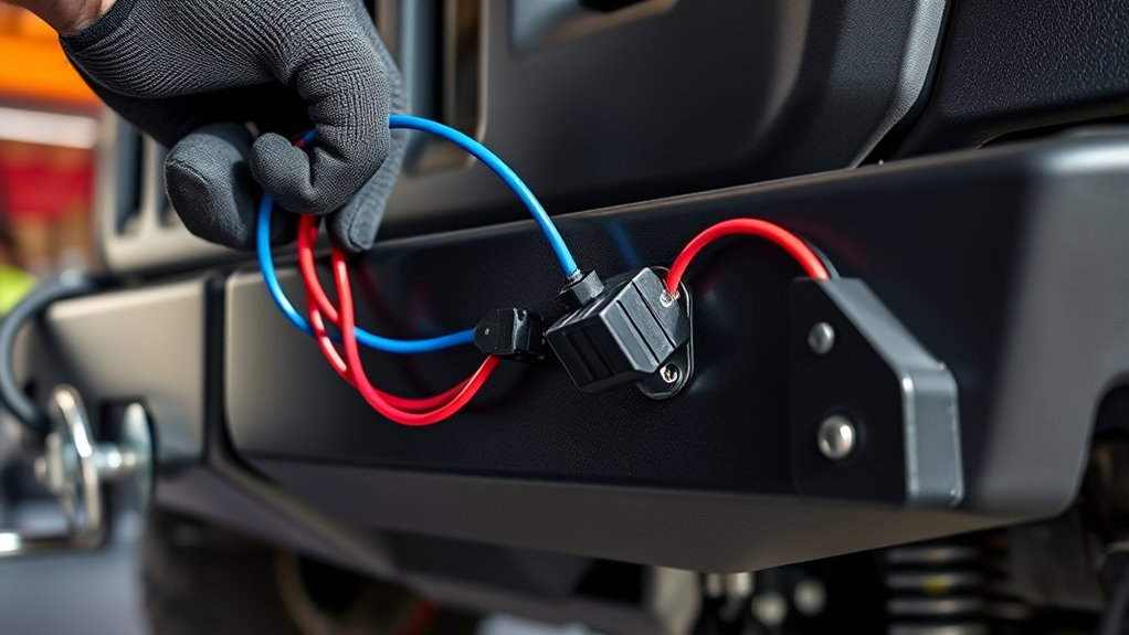 To wire and install auxiliary lighting on your off-road vehicle, start by planning your circuit path from the battery to the switches and lights, ensuring you use high-quality, appropriately rated wiring. Install inline fuses near the battery for safety, and consider using relays to handle higher currents and protect your switches. Securely mount your lights and wiring using heavy-duty brackets, then test everything before hitting the trails. Continuing will help you master the details for a reliable, safe setup.