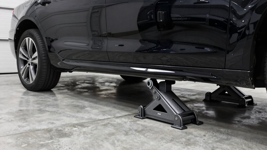 When selecting where to lift your vehicle, look for the manufacturer’s recommended lift points. These are specific areas reinforced to bear the weight of the vehicle without causing damage. Using hydraulic jacks at these points allows you to lift the car safely and evenly. Once the vehicle is elevated, position the jack stands directly under the designated support points. Always make sure the stands are on a flat, solid surface to prevent any shifting or sinking. It’s best to use stands with a wide base for added stability, especially if you’re working on uneven ground or in a garage with a slightly sloped floor. Before fully trusting the stands, gently shake the vehicle to guarantee it’s stable and securely supported. If there’s any wobbling or instability, reposition the stands until you’re confident the vehicle won’t shift unexpectedly. Additionally, understanding proper support techniques and the limitations of hydraulic jacks ensures you maintain a safe working environment.
