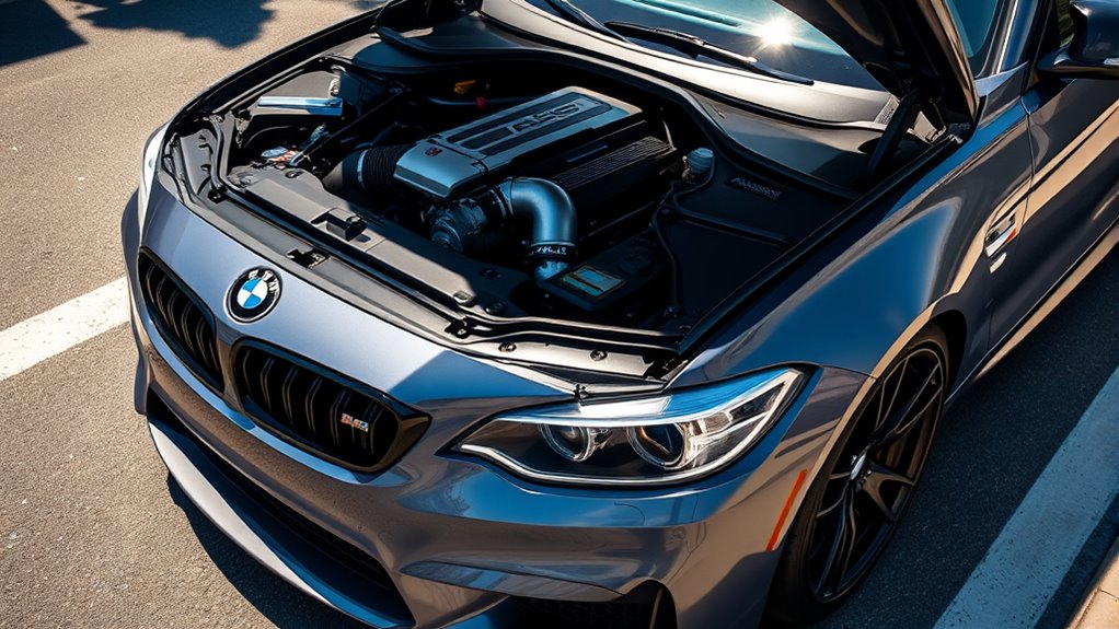To boost your BMW M3’s power, you can upgrade components like turbochargers, intercoolers, exhausts, and fuel injectors, but it’s vital to pair these with professional tuning to optimize performance and guarantee engine safety. Pushing beyond factory limits can cause long-term damage or reliability issues, especially if supporting modifications aren’t upgraded properly. Understanding these strategies and risks will help you make smarter choices for your M3’s enhancements—keep exploring for more insights.
