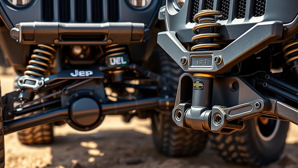 When upgrading your steering stabilizer, you’ll find that JL models require more robust, specially designed stabilizers due to their advanced steering systems and larger tires, while JKs often need straightforward upgrades to improve control after lifting. JL stabilizers typically offer better durability and off-road performance, but both benefit from proper wheel alignment and compatibility with lift height. If you’re curious about specific options and how to choose the best for your Jeep, there’s more to discover behind the scene.