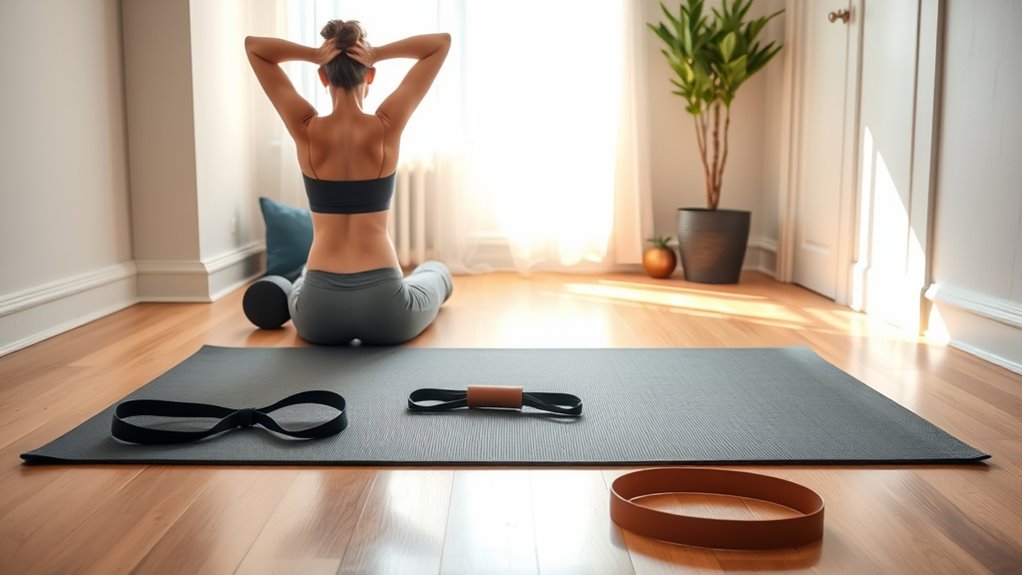 Before starting any back pain exercises, it’s important to evaluate your pain and mobility levels to guarantee safety and effectiveness. Begin by noting where you feel discomfort and how intense it is. This assessment helps you choose appropriate stretching techniques that won’t exacerbate your pain. Pay attention to your mobility; if you notice stiffness or limited movement, start with gentle stretches and avoid aggressive exercises. Staying well-hydrated through hydration strategies supports muscle flexibility and recovery, reducing injury risk. Use proper exercise techniques to minimize strain and maximize benefits. Listen to your body—if certain movements cause sharp or persistent pain, stop immediately. Appraising your pain and mobility regularly ensures you modify exercises as needed, making your back pain management safer and more effective over time.
