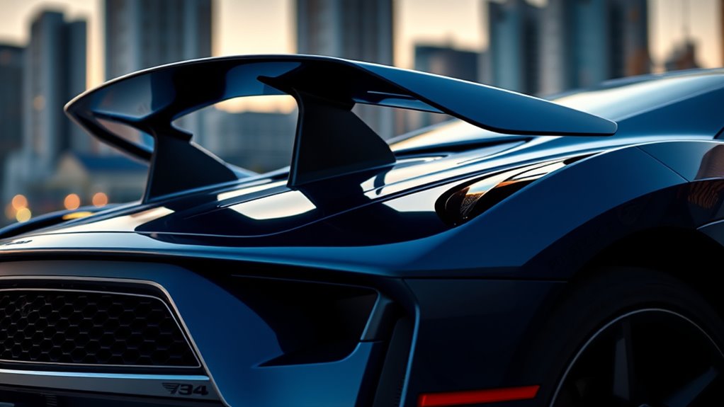 Deployable spoilers work by extending or retracting based on your driving needs. When you accelerate on the straightaway, the spoiler can retract to minimize drag, allowing you to reach higher speeds. Conversely, when navigating a corner or braking, the spoiler deploys to generate additional downforce, pressing the car onto the road for better grip. This dynamic adjustment ensures you get optimal aerodynamic performance tailored to each situation. The key is efficient airflow management—directing air where it’s needed most to enhance stability and reduce turbulence. This continuous, active modulation of aerodynamic elements helps you stay glued to the road and improves your overall driving confidence.