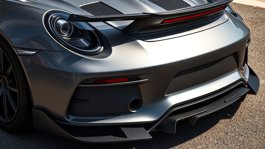 Spoilers are perhaps the most recognizable aerodynamic mods. They work by disrupting airflow to generate downforce, pressing your car down onto the road. This added grip allows you to take corners at higher speeds with more confidence. Properly designed spoilers also help manage airflow behind your car, reducing turbulence and drag. When you choose a spoiler, consider its size and angle; a more aggressive angle increases downforce but can also add to drag if not carefully balanced. The goal is to find a setup that maximizes downforce without considerably increasing drag, keeping your vehicle stable and swift.