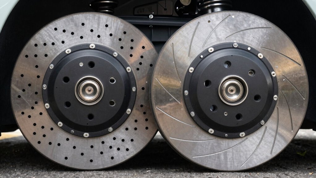 Yes, drilled rotors are more prone to cracking than slotted ones due to thermal expansion. The drilled holes create weak points that can’t handle intense heat buildup, especially during heavy braking. While drilled rotors might produce more noise levels, slotted rotors maintain better structural integrity and resist cracking. So, if you value durability and quieter operation, slotted rotors are a smarter choice for street driving.