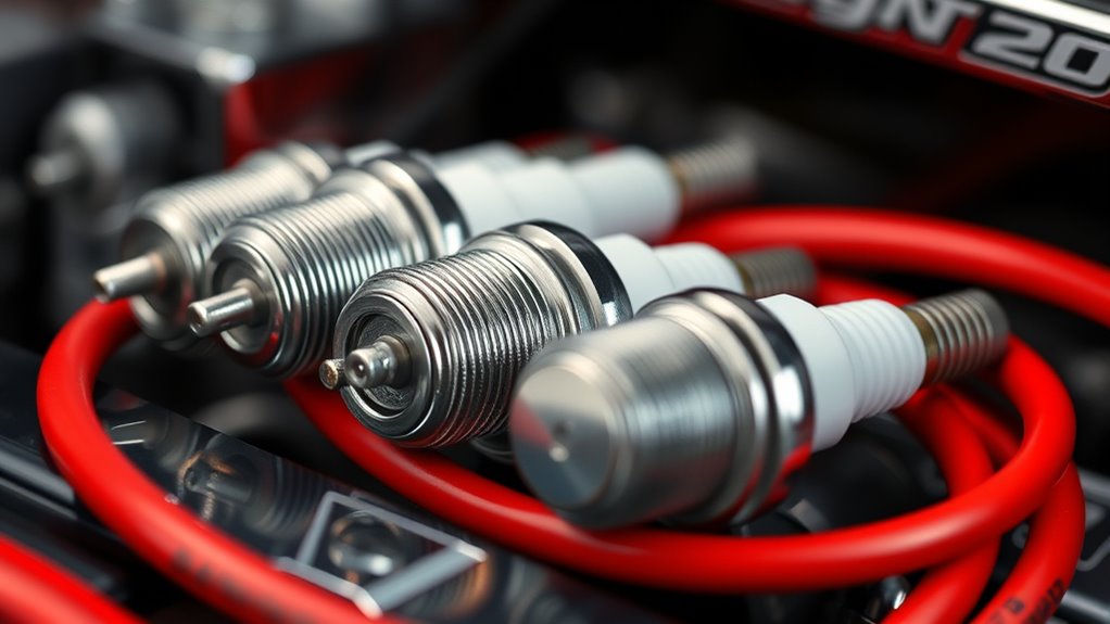Upgrading to high-performance spark plugs and ignition coils helps your engine deliver stronger sparks, leading to more efficient combustion and enhanced power. These components improve throttle response, acceleration, and overall responsiveness while potentially increasing fuel economy. High-quality parts also guarantee durability and reliable operation under demanding conditions. If you want to unlock better engine performance and learn how these upgrades can transform your vehicle, keep exploring to discover more details.