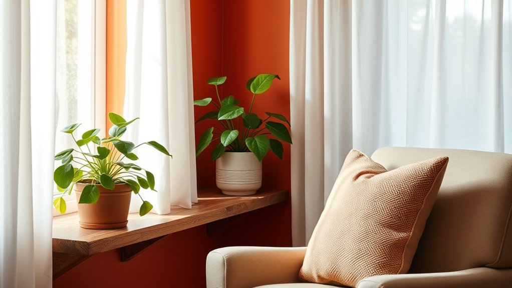 Autumn invites you to embrace its cozy essence through warm, rich tones that evoke the changing leaves and harvest season. Think deep oranges, earthy reds, and golden browns that create an inviting atmosphere. To enhance these hues, masterful color pairing works best when combining warm shades with complementary neutrals, like cream or taupe, for balance. When applying paint, use techniques such as accent walls or layered textures to add depth and visual interest. For example, a faux finish or sponging can give walls a cozy, textured feel that mimics seasonal foliage. Incorporating low light office plants can further soften the ambiance and bring a touch of nature indoors. These application techniques help you evoke autumn’s warmth, making your space feel welcoming and snug. Embrace these rich tones and thoughtful paint strategies to celebrate the season’s comforting, vibrant spirit.