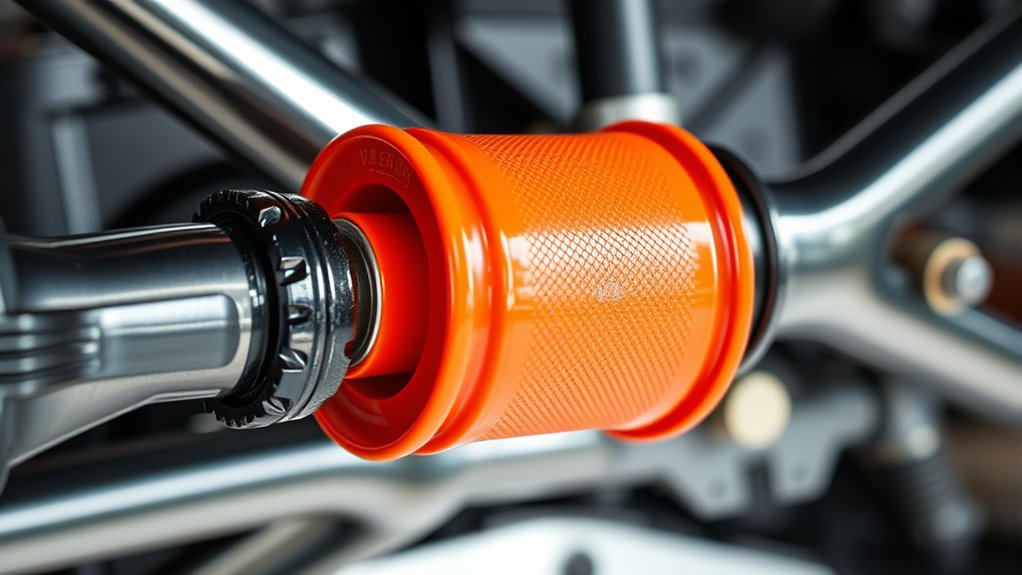 Think of polyurethane bushings as the heartbeat of your car’s precision. To keep them thriving, check them regularly for cracks or wear, especially after rough rides. When installing, use the right installation tools and follow proper tips to prevent damage. Lubricate them with silicone to reduce squeaks, and avoid harsh chemicals. A little upkeep keeps your steering sharp, ensuring your ride remains as smooth as silk and as precise as a surgeon’s scalpel.