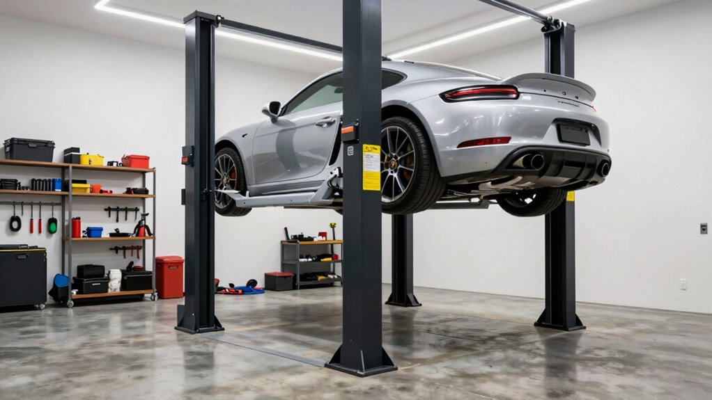 Evaluating your garage’s space and clearance needs is key to selecting the right 2-post lift. First, measure your ceiling height and floor space to guarantee the lift fits comfortably without blocking movement. Think about the maximum lifting height you need for your vehicles; this prevents issues when performing maintenance or repairs underneath. Check the width of the lift and vehicle clearance to allow safe entry and exit, as well as smooth maneuvering around the lift. It’s also important to ensure there’s enough room for the lift’s arms and support structures to extend fully without hindrance. Finally, consider the overall footprint of the lift, making sure it aligns with your garage’s spatial constraints and workflow, so your setup remains functional and efficient.