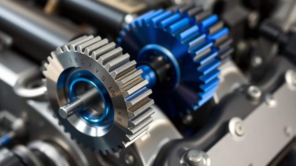 The adjustment range of adjustable cam gears plays a vital role in fine-tuning your engine’s timing, so it’s important to take into account how much flexibility they offer. Typically, this range varies from 0 to 10 degrees in each direction, giving you control over timing adjustments. A wider range allows for more precise tuning, whether you’re optimizing for performance upgrades or emissions. It’s crucial to ensure the gear’s adjustment range matches your engine’s specifications and planned modifications. Look for gears that offer incremental adjustments or a continuous range for maximum precision. Also, consider whether the adjustment remains stable under high RPM and heat conditions, so your settings stay consistent during demanding driving. Flexibility in adjustment range helps reveal your engine’s full potential.