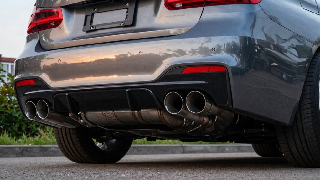 The style and finish of a cat-back exhaust can dramatically enhance your BMW F30 3 Series’s appearance, allowing you to personalize its look to match your taste. Options like black chrome, burnt finishes, or sleek carbon tips add a customized touch that sets your car apart. The design and material of exhaust tips, such as polished T304 stainless or carbon fiber, contribute profoundly to the overall aesthetic and blend seamlessly with your vehicle’s exterior. Choices like single or dual side exits, along with unique tip shapes, give you the freedom to craft a distinctive look. Color and coating options, including matte black, burn finishes, or black chrome, influence whether your F30 appears aggressive or refined. Coordinating these elements with your car’s overall theme creates a harmonious, eye-catching upgrade.