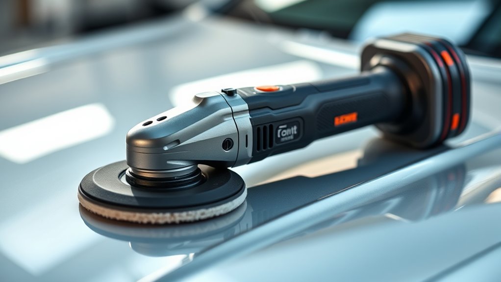 Choosing the right cordless dual action polisher depends heavily on its power and speed options, which directly influence its performance on different surfaces. Multiple speed settings, usually from 2000 to 5800 RPM, give me the flexibility to customize my approach. Higher RPMs offer more aggressive polishing, perfect for removing scratches and oxidation, while lower speeds are ideal for waxing and finishing delicate surfaces. The dual-action mechanism, with adjustable speeds, guarantees smooth, swirl-free results by oscillating the pad while rotating. This control helps prevent damage to sensitive materials. Having a range of speed options makes the tool versatile enough to handle various materials like automotive paint, wood, and metal. Overall, choosing a polisher with adjustable power and speed ensures I can match the task for a flawless finish.