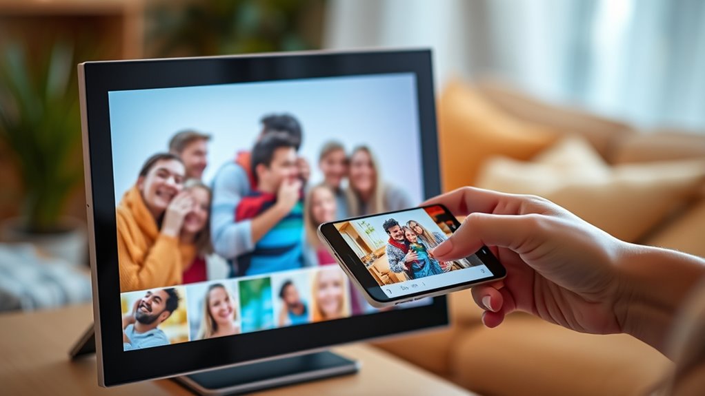 Ever wondered how easy it is to update your digital photo frame with new images? The key is guaranteeing the frame supports email functionality so you can send photos directly to it. Check if it has a dedicated email address or can sync with your existing email accounts like Gmail, Outlook, or Yahoo Mail for smooth transfers. Compatibility with popular email platforms makes photo sharing effortless. Also, verify that the frame’s firmware or app can handle email attachments and automatically process incoming images without hassle. Security is equally important—look for features that keep your photos private and protect against unauthorized access. By confirming these email compatibility factors, you’ll ensure your digital frame is ready for seamless, secure photo sharing whenever inspiration strikes.