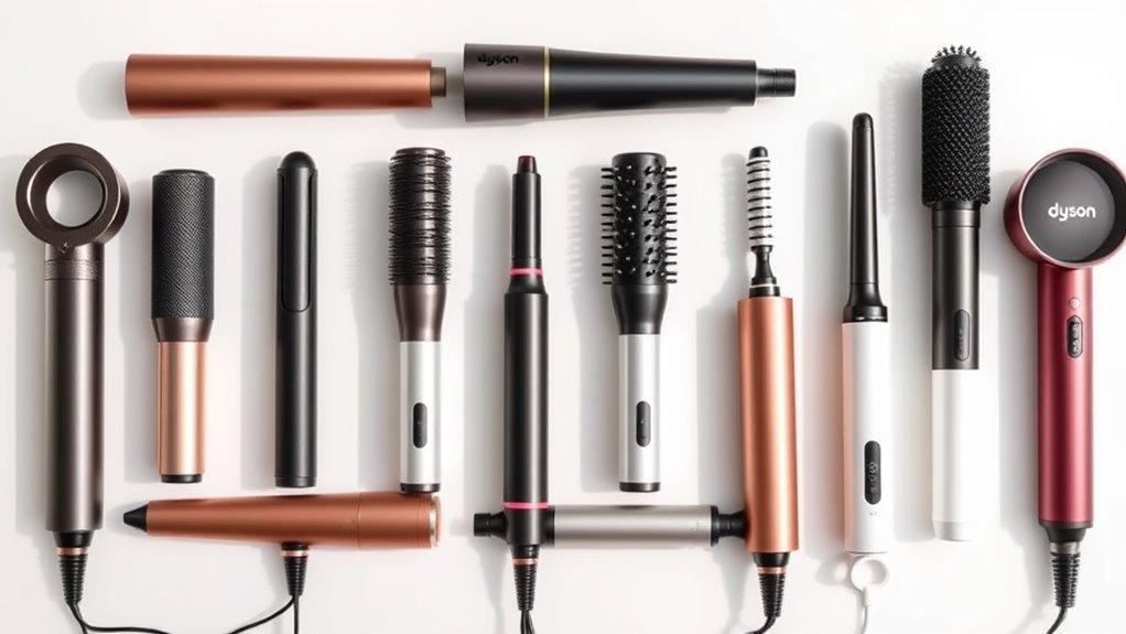 Ever wondered how your hair type affects the best Dyson Airwrap alternative for you? Your hair’s texture and thickness play a vital role in choosing the right tool. Fine or thin hair needs lower heat and gentle airflow to prevent damage and breakage, so look for alternatives with adjustable heat settings. Thick, curly, or coily hair often requires higher heat and stronger airflow to style effectively. The attachments matter too: volumizing brushes work well for fine hair, while smoothing or straightening tools suit coarser textures. For sensitive or damaged hair, features like sensors and smart heat control are essential to protect your hair’s health. Matching your hair type with the right settings and attachments ensures better results and minimizes damage.