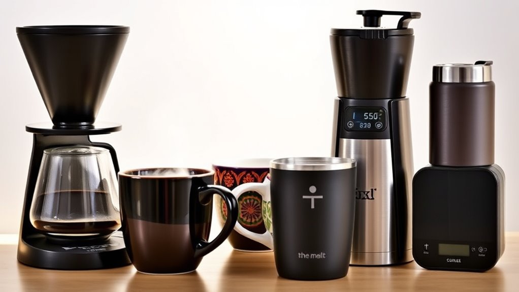 Imagine this: choosing gifts for different coffee brewing methods is like assembling a vintage orchestra. I focus on the recipient’s favorite method—French press, pour-over, espresso—and select tools or accessories tailored to that. For a French press, I pick a quality carafe; for pour-over, a stylish dripper and filters. Knowing their brewing style helps me find thoughtful, practical gifts that elevate their coffee experience.