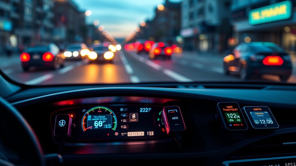 Clear visibility of your HUD depends not only on its display quality but also on the accuracy and reliability of the data it presents. I look for devices that deliver speed readings within a margin of error of less than 2 mph or km/h, ensuring trustworthy information on the road. Reliable OBD2 HUDs should consistently display critical engine parameters like RPM, coolant temperature, and voltage without freezing or data drops. The device’s accuracy hinges on a stable connection to the vehicle’s OBD2 port and a strong GPS signal, especially in tunnels or urban areas. To confirm data accuracy, I cross-verify with my vehicle’s built-in instruments. Regular calibration and firmware updates are essential for maintaining long-term reliability and ensuring the device continues to serve me well on every drive.