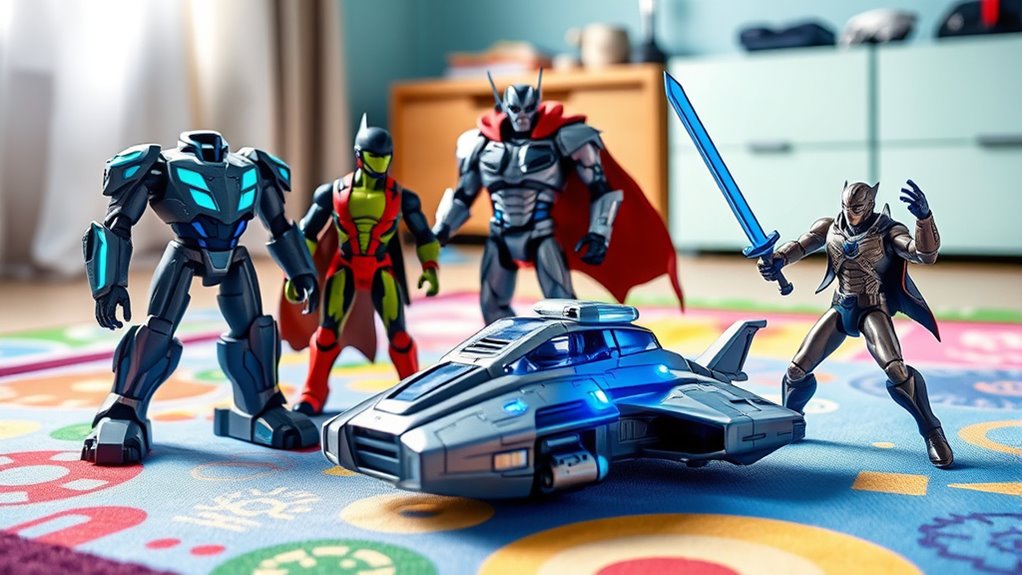 Choosing the right hot toys for 7-year-old boys means paying close attention to age recommendations and safety labels. It’s crucial to select toys designed specifically for their developmental stage to guarantee they match their skills and safety needs. Always check the minimum age labels to avoid choking hazards or unsafe parts that could pose risks. Look for toys that challenge their abilities without being too complicated, fostering confidence and engagement. Educational value is also important—pick toys that encourage creativity, problem-solving, or physical activity appropriate for their age. Additionally, ensure the toy complies with safety standards, using non-toxic materials and secure components. This careful consideration helps find a toy that’s both fun and safe, supporting healthy growth and development.