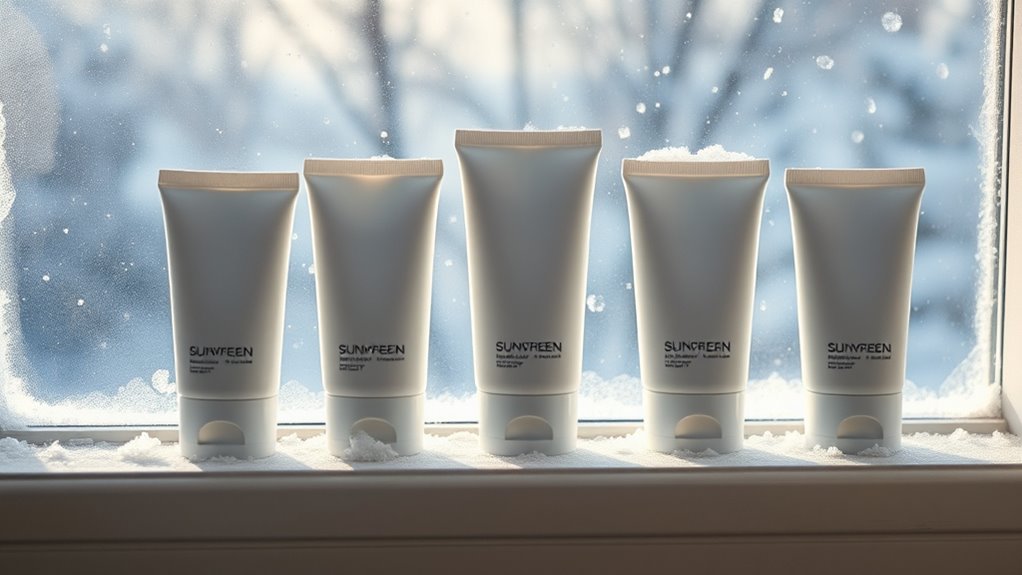 You should reapply your sunscreen every two hours in winter, just like clockwork. Cold weather and snow can reflect UV rays, making your skin vulnerable even on cloudy days. If you’re outside for extended periods or sweating, reapply more often. Don’t forget your lips and any exposed skin. Staying consistent keeps your skin protected from harmful rays, ensuring you don’t get caught off guard by winter’s sneaky UV exposure.