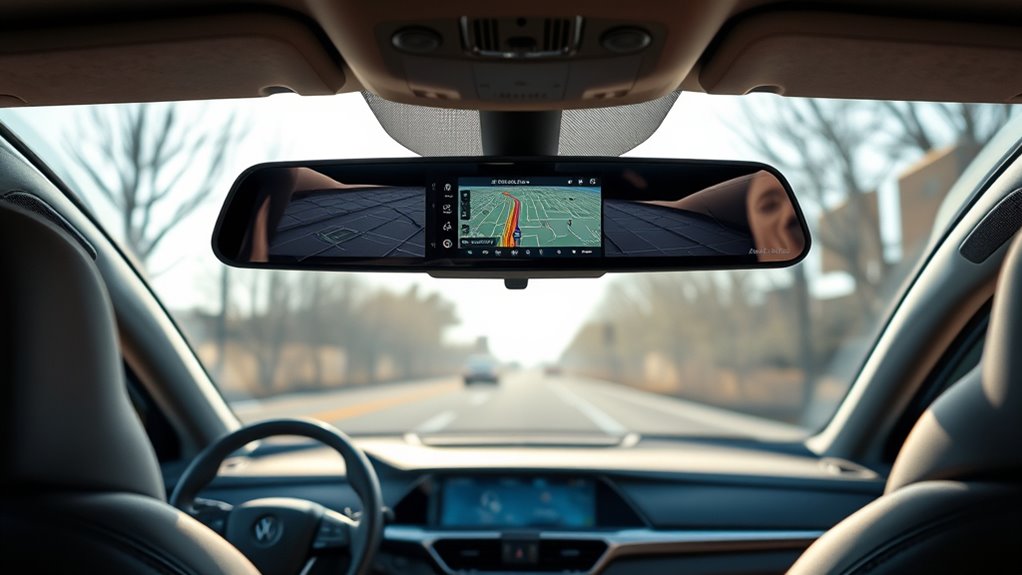 Mirror dash cams integrate with vehicle safety systems by connecting to your car’s onboard network via Bluetooth or Wi-Fi. I’ve noticed they can sync with emergency systems, alerting me of potential hazards or system malfunctions. Some models even communicate with parking sensors or collision avoidance features, enhancing overall safety. This integration provides real-time data sharing, helping me stay aware and react swiftly to any driving risks.