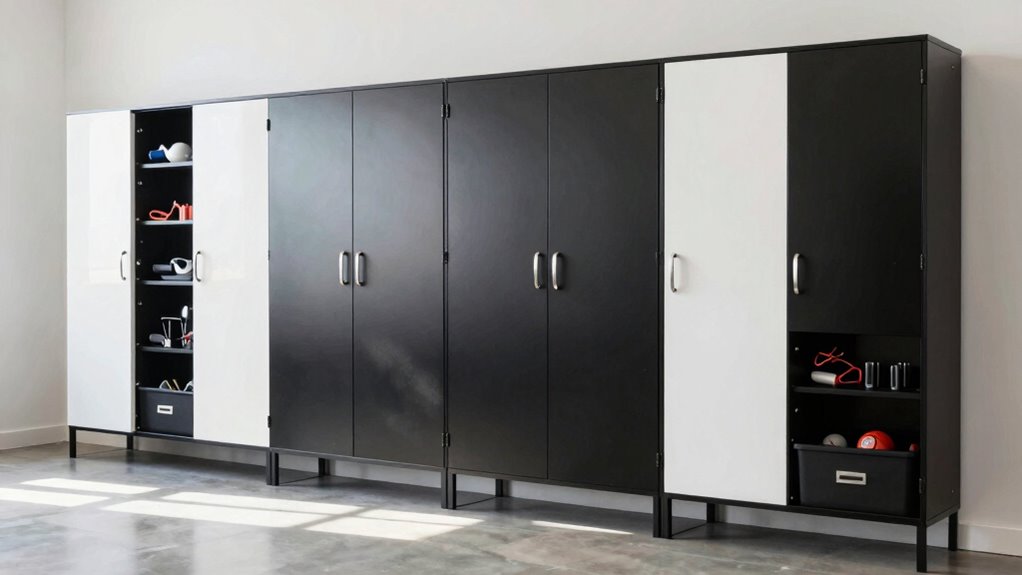 Incorporating security and locking features into your modular garage storage system guarantees that your tools and valuables stay protected. Locks such as independent locks on doors and drawers prevent unauthorized access, keeping sensitive items safe. High-quality locking mechanisms, like three-point locks and steel rods, offer enhanced security against tampering and forced entry. These features help organize your garage by restricting access to specific areas, reducing clutter and theft risks. Secure locking systems are especially important in shared or busy workshop environments, safeguarding both tools and users. By choosing cabinets with reliable locks, you ensure your valuables remain private and protected, giving you peace of mind while maintaining a tidy and secure workspace.