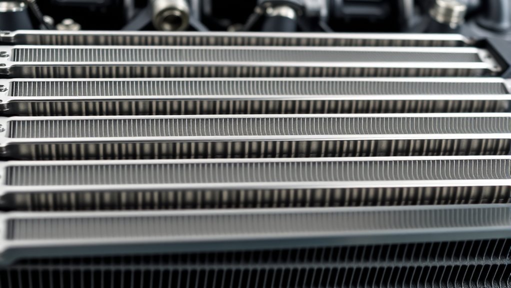 Efficient heat dissipation in an oil cooler sandwich plate hinges on several key factors. First, the material’s thermal conductivity matters—aluminum is a top choice because it transfers heat quickly and effectively. The design also plays a role; larger surface areas and fin structures help transfer heat away from engine oil more efficiently. Port size and count, like inlet and outlet diameters, determine how much oil can be cooled at once, impacting overall heat exchange. Adding features such as thermostats or integrated coolers can boost performance further. Lastly, proper installation is vital—making sure the plate contacts engine components well and minimizes air gaps ensures maximum heat transfer. Considering these factors helps select a sandwich plate that keeps your engine running cool and efficient.