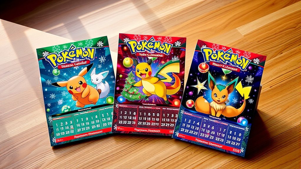 Choosing a Pokémon TCG holiday calendar in 2025 isn’t just about the contents inside; the collectible appeal plays a key role in its value and desirability. Exclusive foil cards and seasonal-themed accessories considerably boost its appeal, especially for collectors. Limited edition figures and special finish battle figures make the calendar stand out and increase its desirability. Unique holiday-themed packaging and design details add a festive touch, transforming the calendar into a memorable keepsake. The variety and rarity of included items, like rare foil cards or exclusive accessories, directly impact how attractive the calendar is to fans. Overall, a well-designed presentation and cohesive Pokémon branding heighten its appeal, making it not only a fun countdown but also a valuable collectible for enthusiasts.