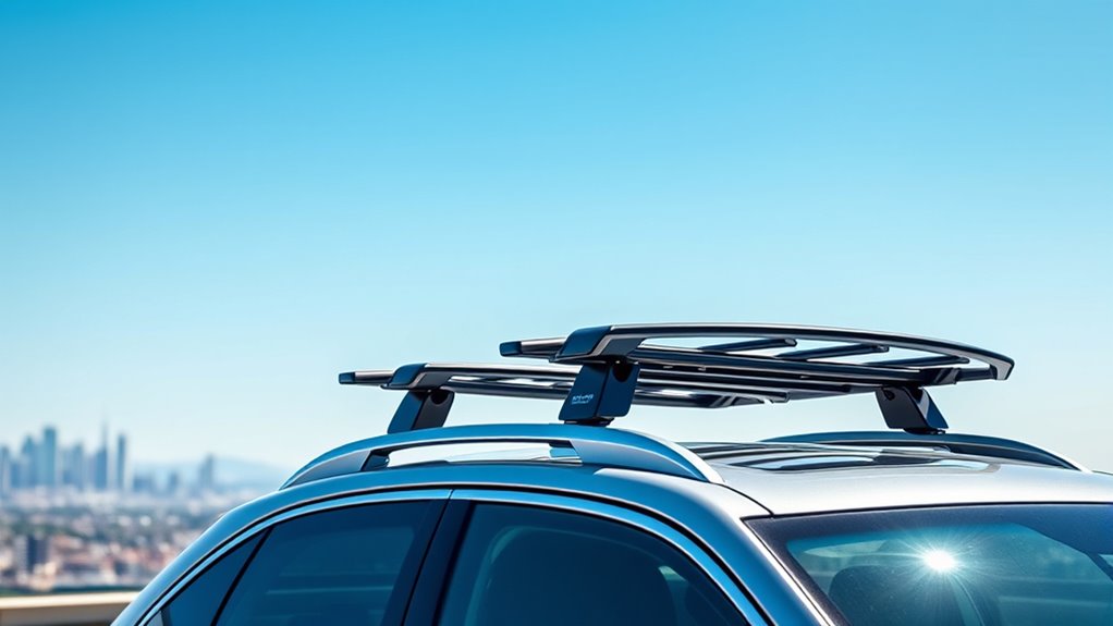 Aerodynamic design plays a key role in how well your roof rack crossbars perform during travel. Well-designed crossbars reduce wind resistance and drag, which can boost your vehicle’s fuel efficiency. Contoured or streamlined shapes help minimize wind noise and vibrations, making your drive quieter and more comfortable. Tapered or curved ends direct airflow smoothly over the roof, decreasing turbulence and improving overall handling. The low-profile shape not only enhances your vehicle’s aesthetic but also prevents the crossbars from protruding too much or getting damaged. Proper aerodynamic design can cut wind resistance by up to 70%, resulting in less noise and better high-speed stability. Choosing crossbars with these features ensures you get a quieter, more efficient, and visually appealing roof rack setup for your vehicle.