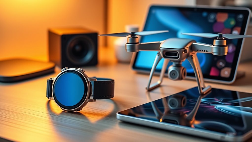The latest emerging tech trends for dad gifts in 2025 include smart home devices, wearable tech with health tracking, and augmented reality gadgets. I love how smart speakers and security systems make life easier, while fitness wearables help dads stay active and healthy. Augmented reality glasses are also gaining popularity, offering immersive experiences. Staying updated on these trends guarantees you pick a gift that’s innovative, practical, and sure to impress him.