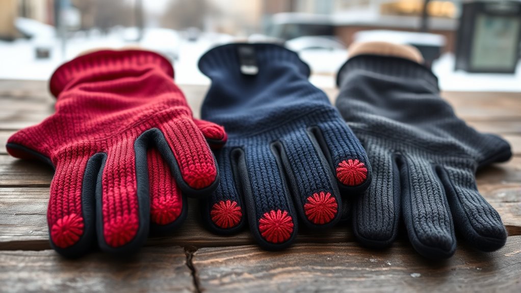 Choosing the right touchscreen gloves means making sure they work seamlessly with your device. I look for gloves with conductive material on all fingertips or at least the thumb and index finger to guarantee full compatibility. It’s important to check if the gloves’ touchscreen capability matches my device’s screen type, whether capacitive or resistive. I also verify the sensitivity level, so the gloves respond accurately and quickly during use. Durability matters, so I choose gloves with conductive fibers resistant to wear, maintaining functionality over time. Additionally, I prefer gloves designed for on-the-go use, allowing me to operate my device without removing them, especially in cold weather. These factors help me stay connected without sacrificing warmth or convenience.