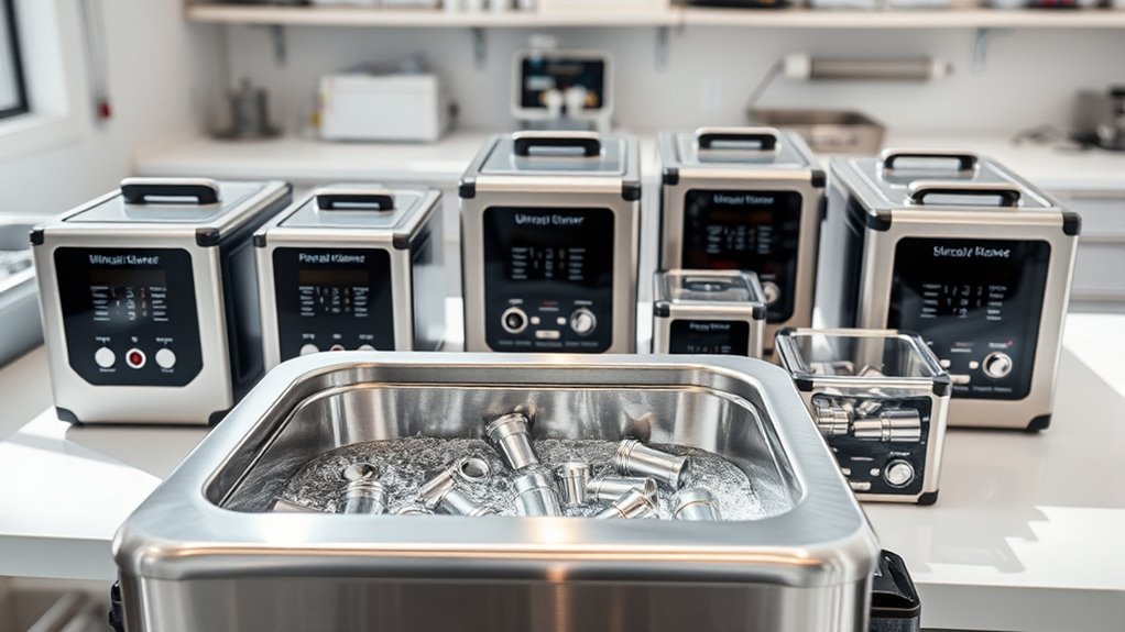 Choosing the right ultrasonic cleaner involves paying close attention to both power and frequency, as these factors directly influence cleaning performance. Frequencies between 20 kHz and 80 kHz are common; lower frequencies (20-40 kHz) generate stronger cavitation, ideal for heavy-duty cleaning of tough grime and industrial parts. Higher frequencies (above 40 kHz) produce gentler cleaning, perfect for delicate items like jewelry and electronics. Power, measured in watts, also impacts cleaning speed and thoroughness—more wattage (180W-600W) means faster, more effective results. Combining higher frequency with increased power can boost efficiency but may also increase noise and risk damage to sensitive objects. Selecting the right balance depends on the size and delicacy of what you’re cleaning, ensuring optimal results without harm.