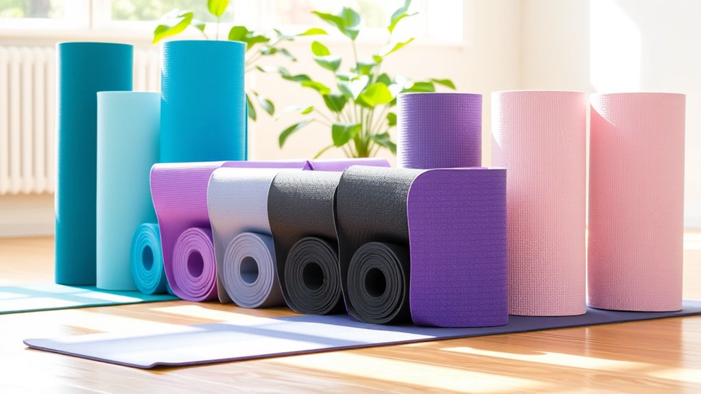 Selecting the right thickness for your yoga mat is essential for comfort and stability. Thicker mats, around 6mm to 8mm, offer more cushioning, which helps reduce pressure on joints and prevents discomfort during poses. This extra padding is especially beneficial for beginners with sensitive or sore knees and wrists, making practice more comfortable and reducing injury risk. However, increased thickness can slightly decrease stability, so finding a balance between softness and support is key. For high-impact or floor-based exercises, a thicker mat provides better shock absorption and comfort. Proper cushioning also aids in maintaining proper body alignment, helping you hold poses longer and improve flexibility. Choosing a mat with the right thickness guarantees a safer, more comfortable practice as you build strength and confidence.